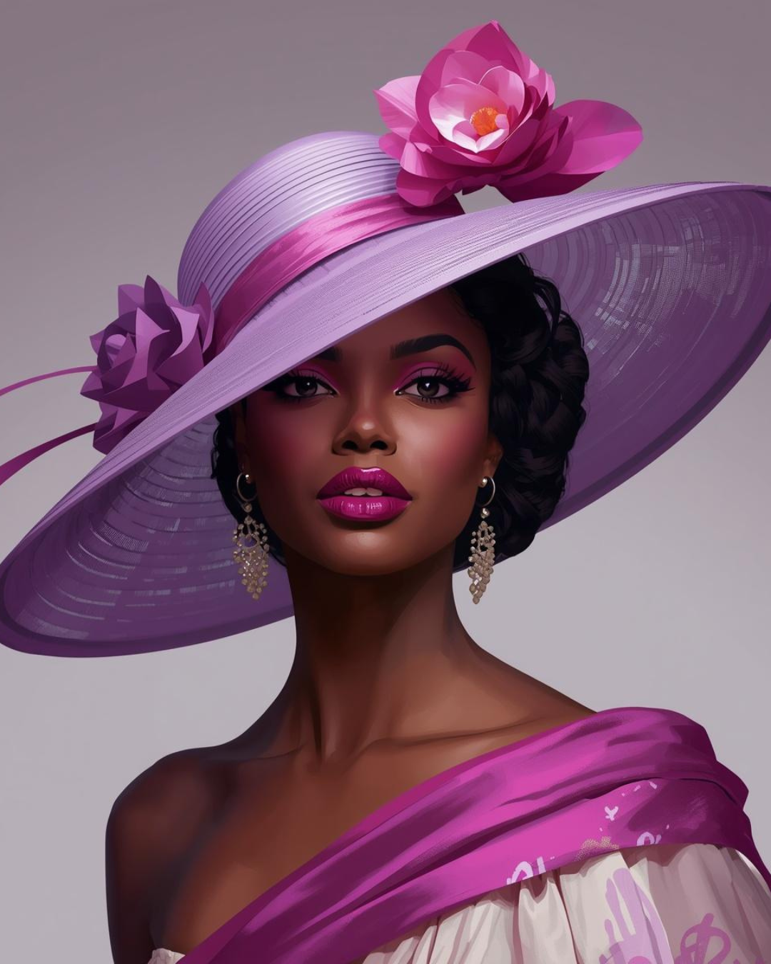 She is wearing a wide-brimmed hat and is attending a performance at a theater, at the opera, at the movies, or any indoor seated event where her hat must be removed if people are seated behind her.